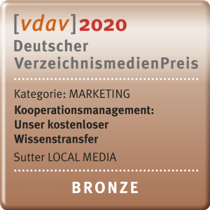Sutter LOCAL MEDIA verbindet fast 100 Jahre Erfahrung im lokalen Marketing mit modernen Digitallösungen. Seit 1927 unterstützen wir kleine und mittelständische Unternehmen (KMU) deutschlandweit dabei, ihre Sichtbarkeit zu erhöhen und von potenziellen Kunden gefunden zu werden. Als traditionsreiche Verlagsgruppe stehen wir für Vertrauen, Kompetenz und starke Marken. Unsere Verzeichnisse genießen seit Jahrzehnten hohe Glaubwürdigkeit und werden von Google als zuverlässige Datenquelle genutzt – ein klarer Vorteil für deine Auffindbarkeit in Suchmaschinen.